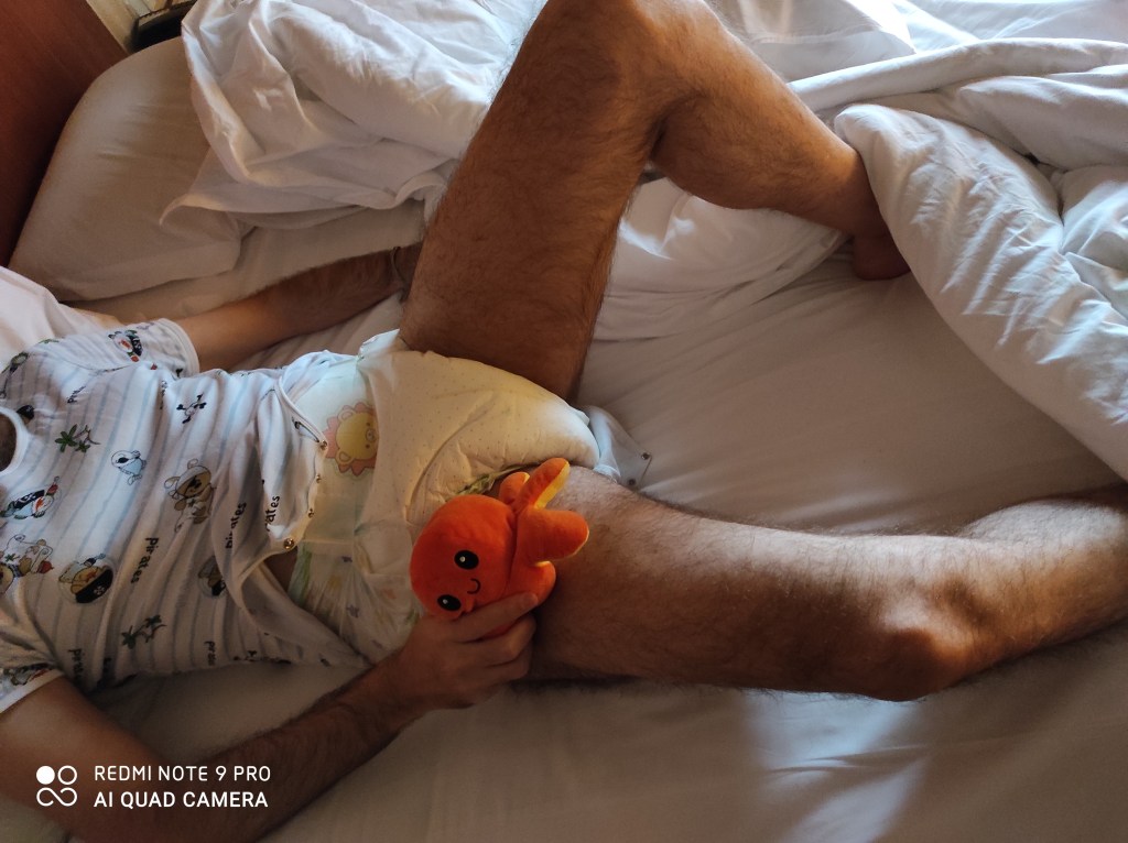 Luego, lo único que me vi capaz de hacer fue abrazarme a mi Osi y buscar a la seño con la mirada. Pero la seño no estaba allí :(. Vendría más tarde para el roleplay de las adopciones (si sobrevivía a la hora de espera con el calorazo, que esa era otra). Tenía que sobreponerme a su ausencia y soltarme un poco. Animarme. Divertirme. “¡Vamos, tío!” -me decía- “¡Estás sentado a una mesita en onesie, peto y pañales junto con otros dos little! ¡Tienes colores, papeles, peluches…! ¡Tienes de todo, como el de las gambas y los chopitos! ¿A qué esperas, gilipollas? ¡Ríe! ¡Salta! ¡Méate encima!”.