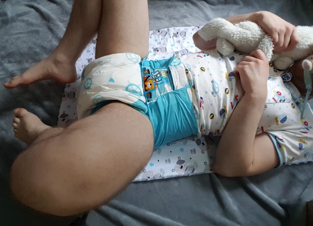 Se volvió hacia el centro de la habitación. Pablo estaba tumbado boca arriba sobre un mantelillo de juegos gris extendido a modo de alfombra, vistiendo una camiseta corta, con estampado de cochecitos y locomotoras. El chupete afloraba de su barba como una boya azul. Un grueso pañal desechable, adornado con una cinta de plástico como de dibujos animados hacía las veces de calzoncillo. Tenía abiertas las piernas para estar más cómodo -el manspreading más inofensivo de la historia-, pero no debía de estarlo mucho, porque se medio tapaba la cara con un osito de peluche muy sobado, al que le habrían venido bien un par de lavadoras. Y por si las sorpresas fueran pocas, Maite descubrió una adicional: su novio se había depilado de cuerpo entero. En los demás detalles de la habitación se fijó de pasada: la cama, el armario, el sofá y los ganchos y argollas de las paredes y el techo.